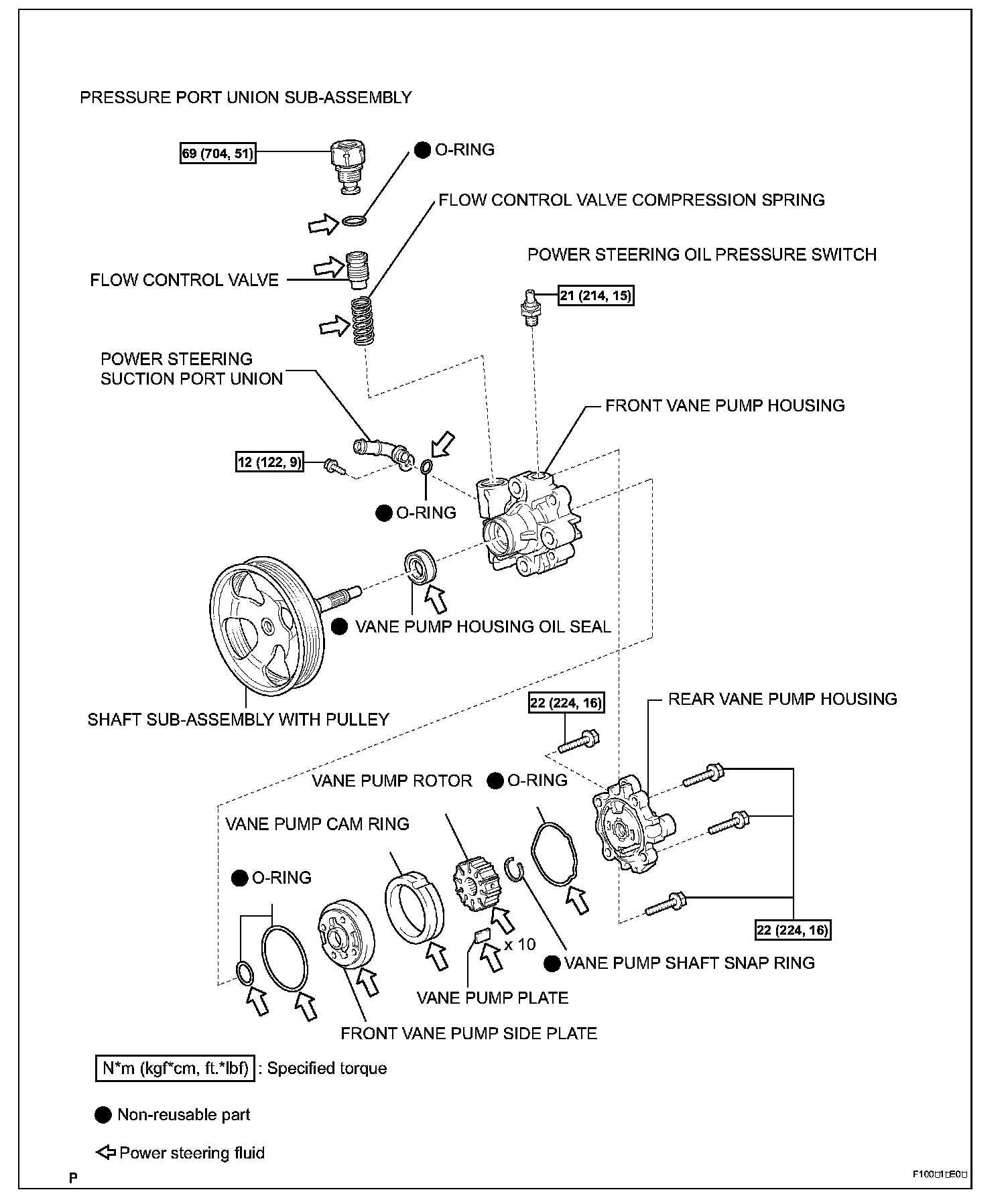 ^ When installing, coat the parts indicated by arrows with power steering fluid.