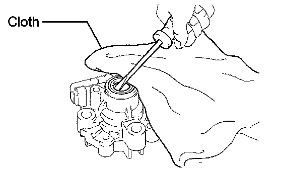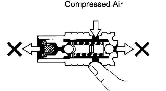 b. Check the flow control valve for leakage. Close one of the holes and apply compressed air, 392 to 490 kPa (4 to 5 kgf/cm2, 57 to 71 psi), into the opposite side hole, and confirm that air does not come out from the end holes.