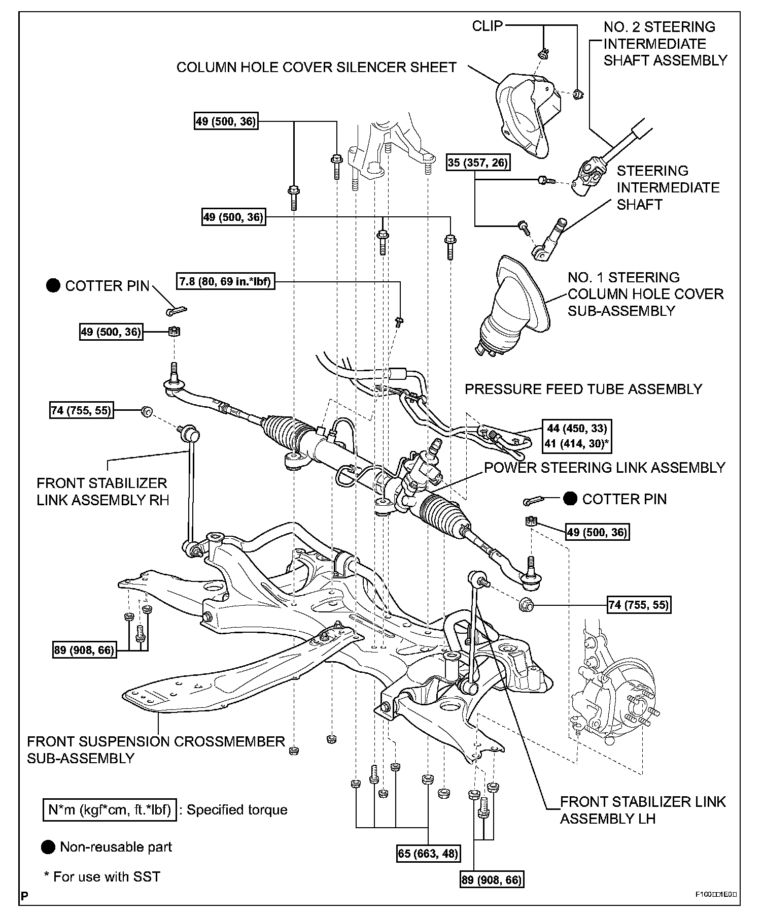 f. Remove the 2 nuts and crossmember with power steering link.