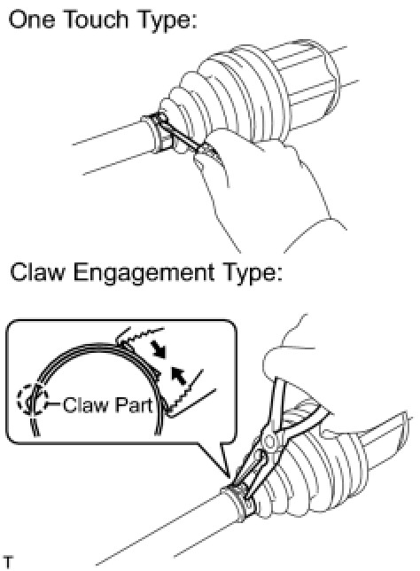 (b) Using needle-nose pliers, remove the inboard joint boot clamp, as shown in the illustration (for Claw Engagement Type).