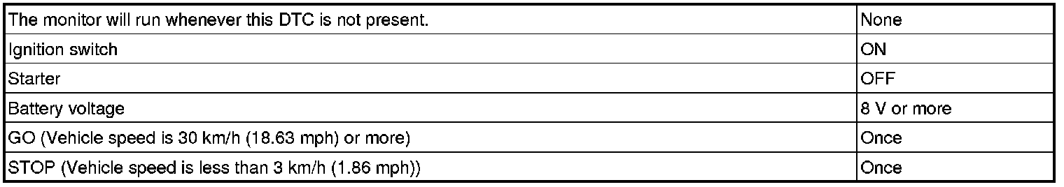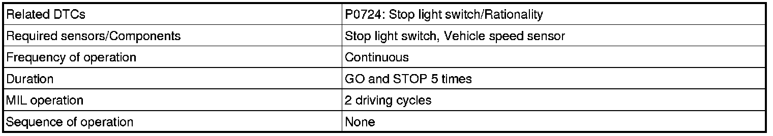 This DTC indicates that the stop light switch remains on. When the stop light switch remains ON during "stop and go" driving, the ECM interprets this as a fault in the stop light switch and the MIL comes on and the ECM stores the DTC. The vehicle must stop (less than 3 km/h (2 mph)) and go (30 km/h (19 mph) or more) 5 times for two driving cycles in order to detect a malfunction.
