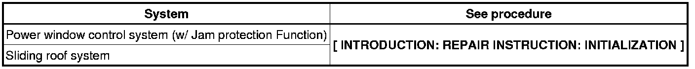 When disconnecting the cable from the negative (-) battery terminal, initialize the following systems after the cable is reconnected.