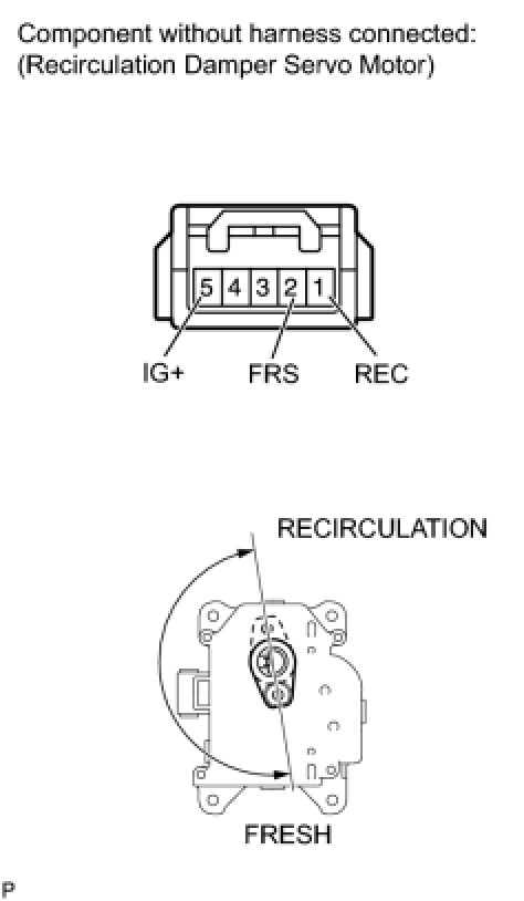 (b) Connect the positive (+) lead from the battery to terminal 5 (IG+) and negative (-) lead to terminal 1 (REC), then check that the arm turns to the "RECIRCULATION" side smoothly.