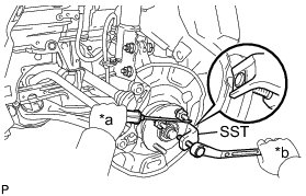 (b) Using SST and a screwdriver or the equivalent to hold the front axle, remove the front axle hub bolt.
