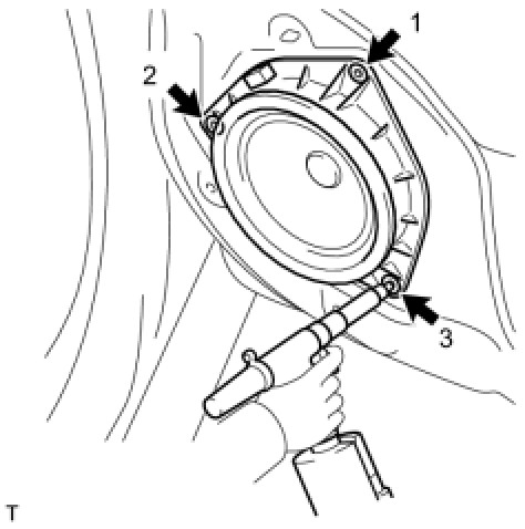 (a) Using an air riveter or hand riveter, install the rear speaker with 3 new strike rivets.