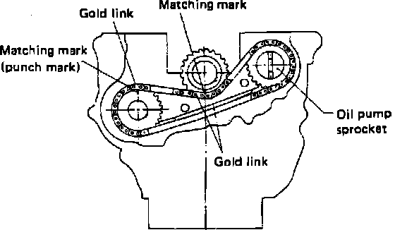 20. Install chain and crankshaft, then align marks on sprockets with gold links on chain as shown in Fig. 34.