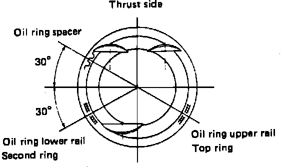 22. Position ring end gaps as shown, Fig. 35, then install piston/rod assemblies into cylinders. Ensure intake valve recesses on piston face intake manifold side of engine.