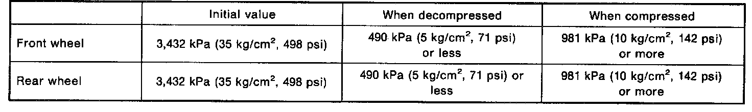 7) Read values indicated on the pressure gauge and check if the fluctuation of the values between decompression and compression meets the standard values. Also check if any irregular brake pedal tightness is felt.