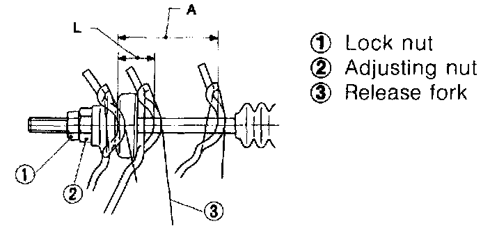 2) If it is not in specified value, adjust it by turning adjusting nut on engine side end of clutch cable.