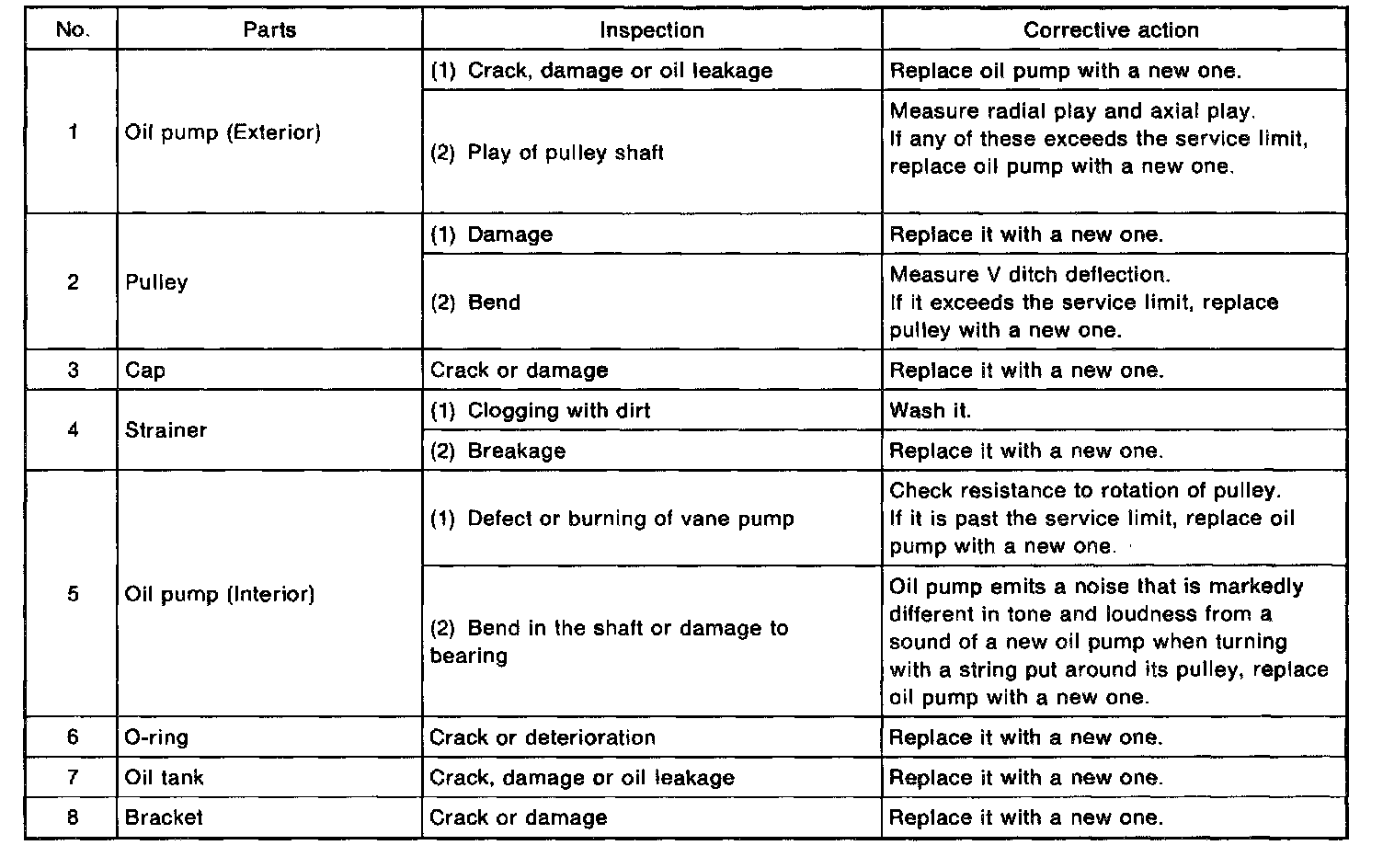 In accordance with the following table, check all removed parts for wear and damage, and make repair or replacement if necessary.