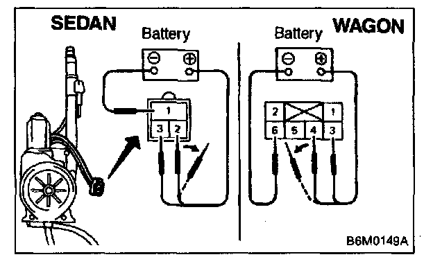 1. Connect battery positive (+) terminal to terminal No.3 and connect terminal No.1 (SEDAN) or No.6 (WAGON) to ground. Ensure that antenna rod extends properly when battery positive (+) terminal is connected to terminal No.2 (SEDAN) or No.4 (WAGON).