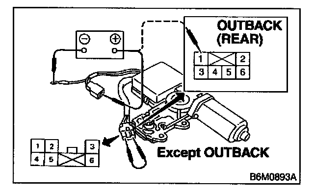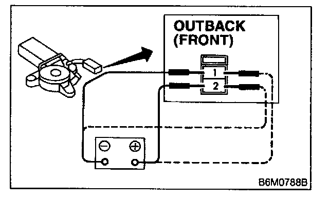 SUNROOF MOTOR1. Apply battery voltage between 1-pin connector (Except OUTBACK) or terminal No.1 (OUTBACK) and body ground wire.