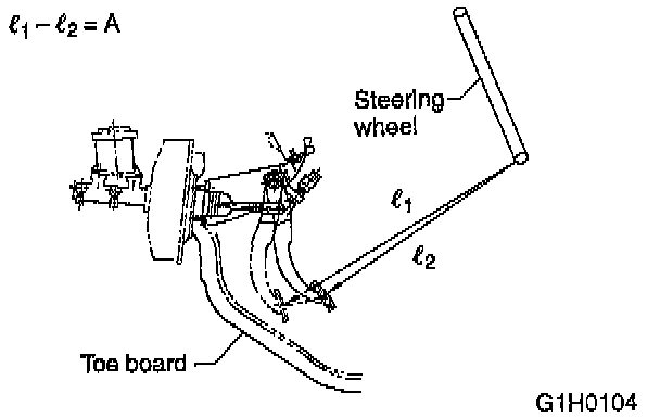 While the engine is idling, depress the brake pedal with a 490 N (50 kg, 110 lbs.) load and measure the distance between the brake pedal and steering wheel. With the brake pedal released, measure the distance between the pedal and steering wheel again. The difference between the two measurements must be less than 90 mm (3.54 inch) [with ABS, 95 mm (3.74 inch)]. If the distance is more than specified, there is a possibility air is in the inside of the hydraulic unit.