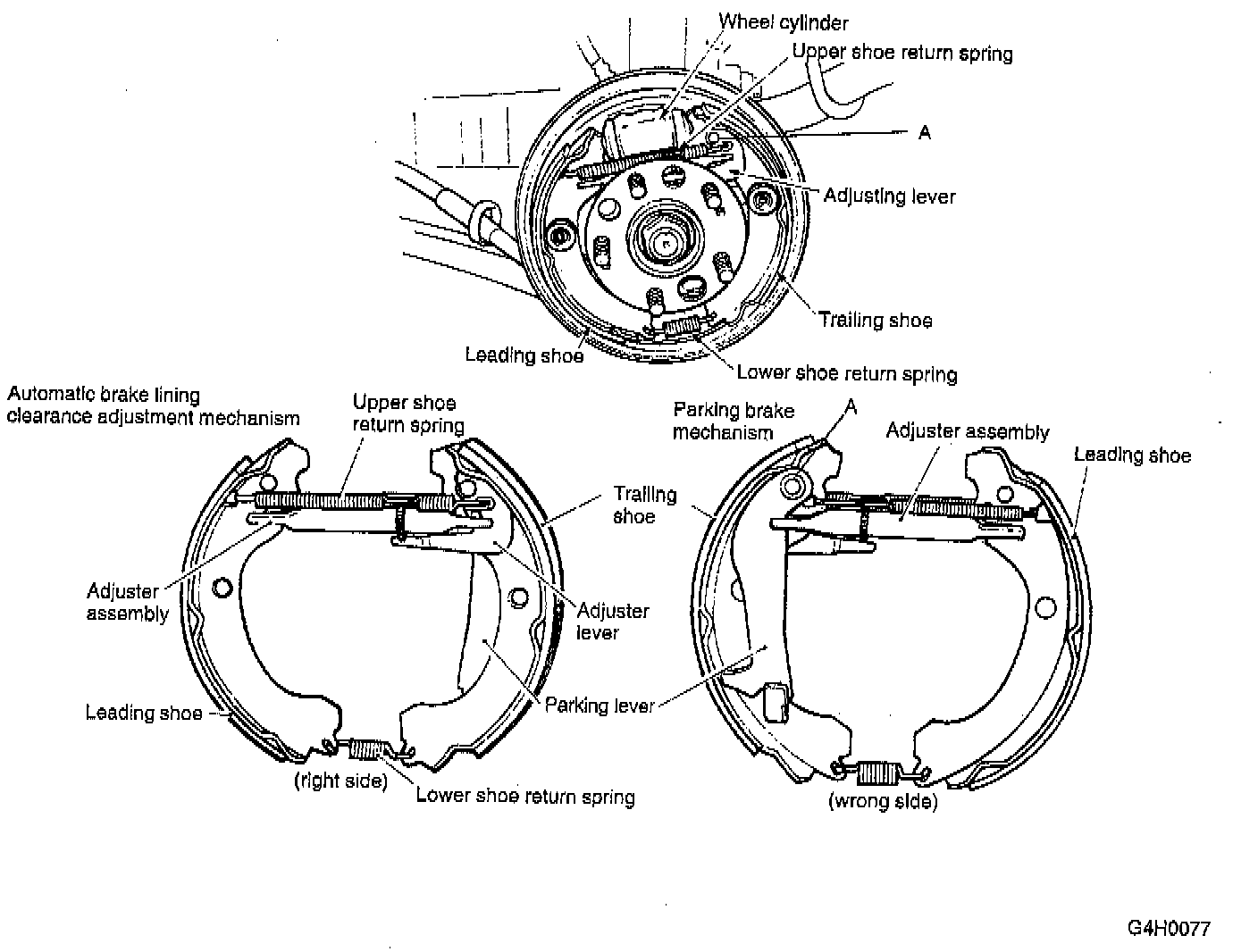 When the parking brake lever is moved up, a lever in the drum brake moves with point "u (traction)" as a fulcrum so that the trailing shoe expands. The leading shoe also expands by way of the adjuster assembly. In this way, braking force will occur.
