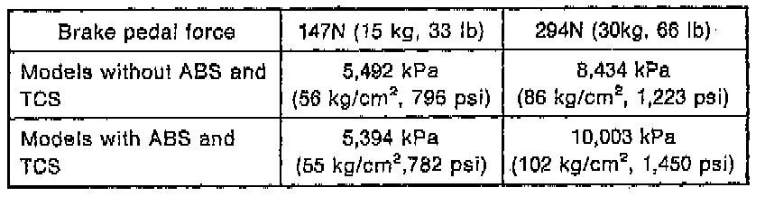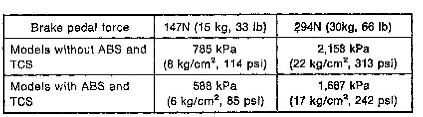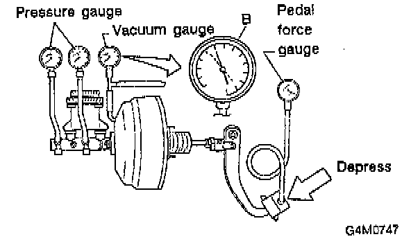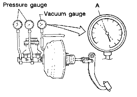 Turn off engine, and set the vacuum gauge reading at "0". Then, check the fluid pressure when brake pedal is depressed. The pressure must be greater than the standard value listed.