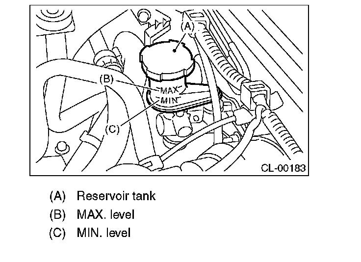 2. Inspect the fluid level using the scale on the outside of the reservoir tank. If the level is below "MIN", add fluid to bring it up to "MAX", and also inspect for leakage.
