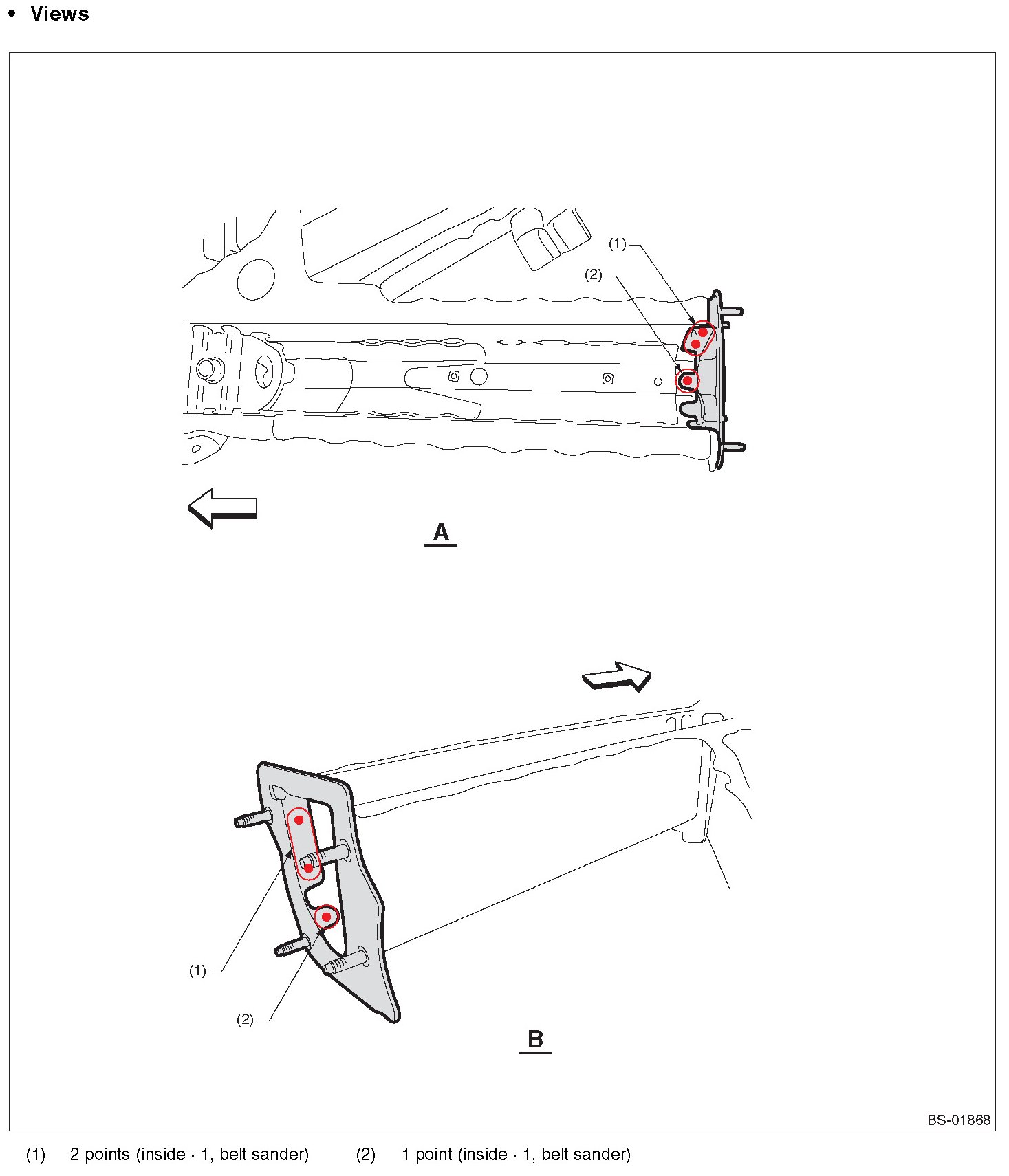 - Symbols and number of points indicate the welding method and the number of welding points. Text in brackets indicate the direction of removal for welded parts, and numbers indicate the number of panels to be drilled to remove welded sections of panels.