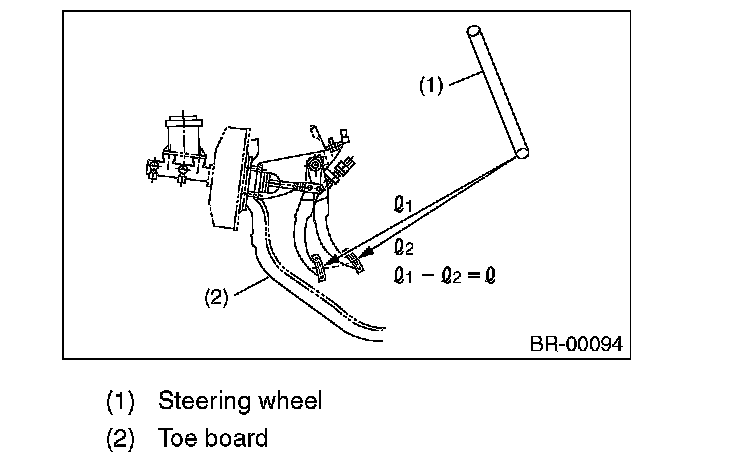 Run the engine at idle after warming up the engine, and depress the brake pedal with a force of 500 N (51 kgf, 112 lb). Measure the distance between the brake pedal and steering wheel. Release the pedal, and measure the distance between pedal and steering wheel again.