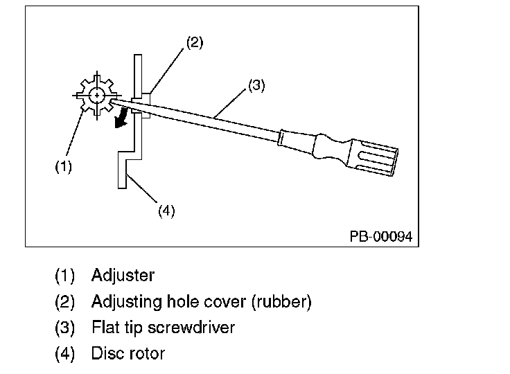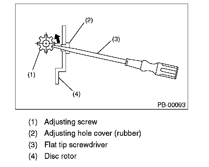 (1) Turn the adjusting screw using a flat tip screwdriver until the brake shoe moves adequately away from the disc rotor.