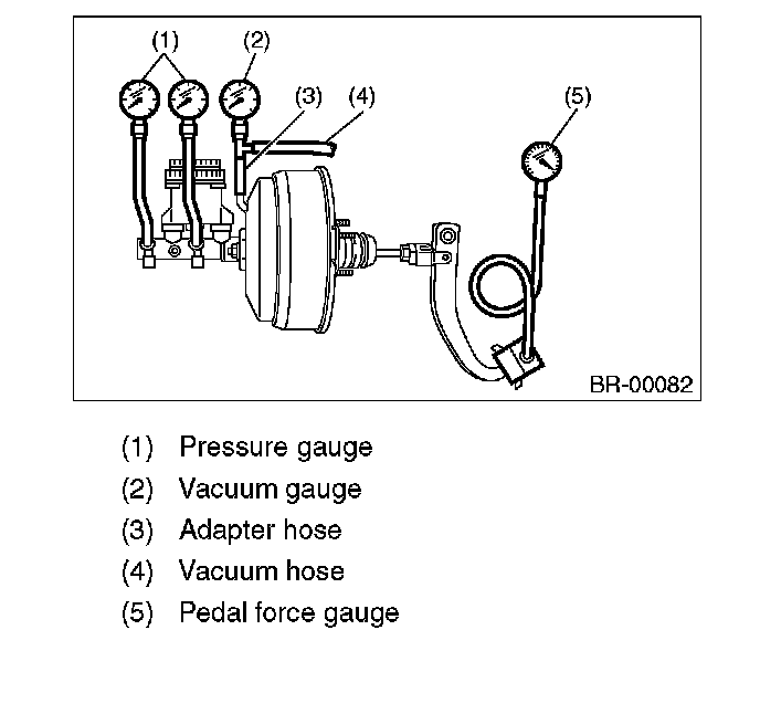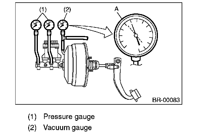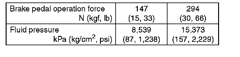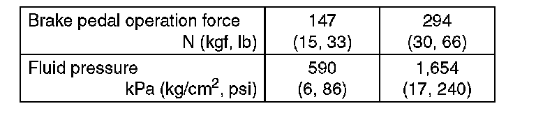 Turn the engine OFF, and set the value of the vacuum gauge to "0". Then, check the fluid pressure when the brake pedal is depressed. The pressure must be greater than the specification listed.