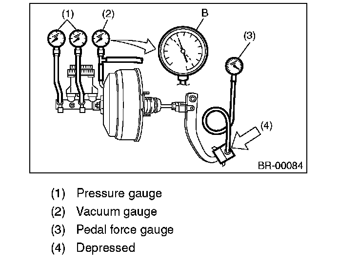 1) Start the engine and depress the brake pedal with a pedal force of 196 N (20 kgf, 44 lb). Keep the engine running and keep the pedal pressed until a vacuum of point B = 66.7 kPa (500 mmHg, 19.69 inHg) is indicated on the vacuum gauge.
