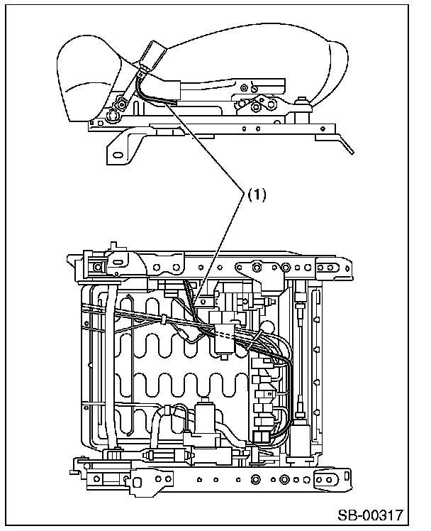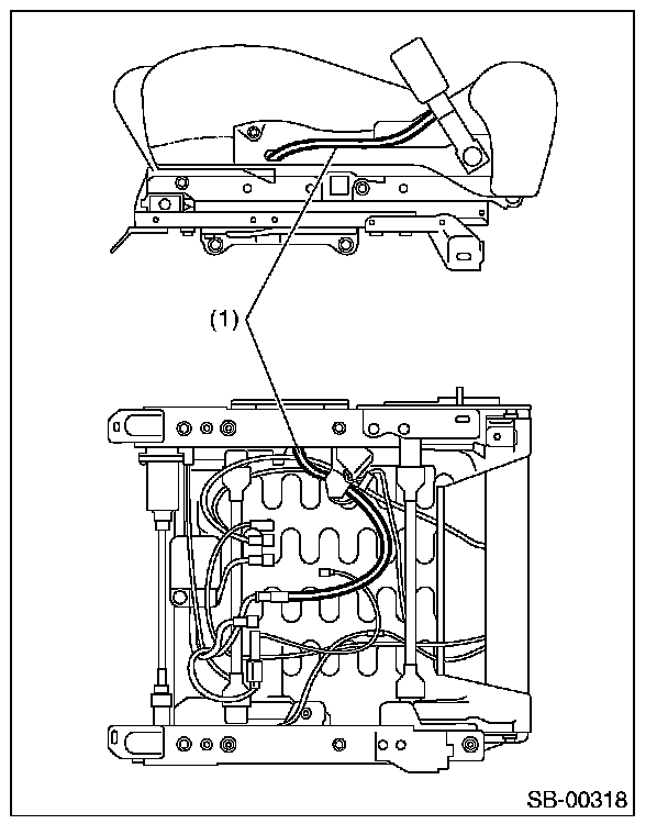 - Inner seat belt assembly harness (1) must be routed securely as shown in the figure, as it can affect the performance of the seat position sensor and occupant detection system.
