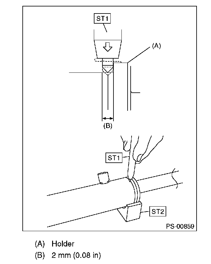 18) Using the ST, crimp so that the diameter of punch hole is 2 - 2.5 mm (0.08 - 0.10 in) and is aligned to the position of 2 mm (0.08 in) from gearbox cylinder end surface.