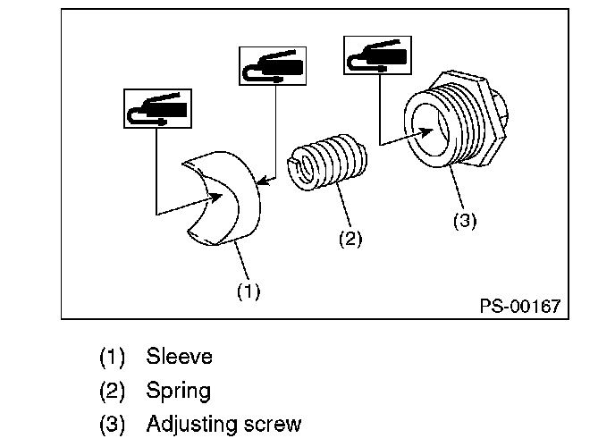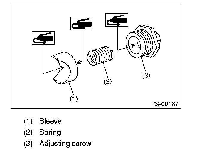 20) Apply liquid gasket to more than 1/3 of entire perimeter of adjusting screw thread.