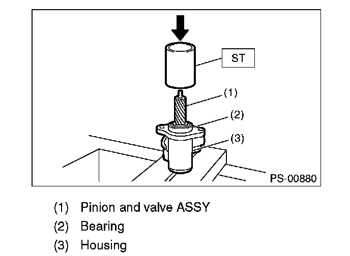 13) Using the ST and a press, push the outer race of bearing and press-fit the pinion and valve assembly into housing.