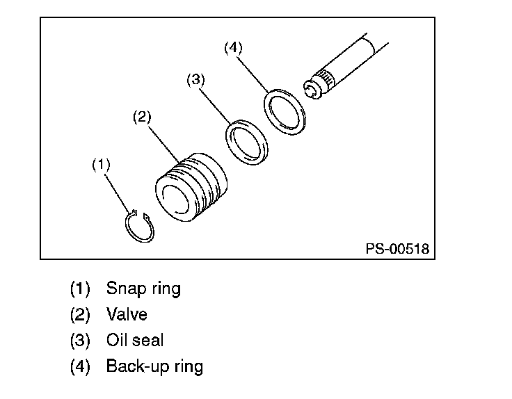 11) Using a snap ring pliers, remove the snap ring, valve, oil seal and back-up washer.