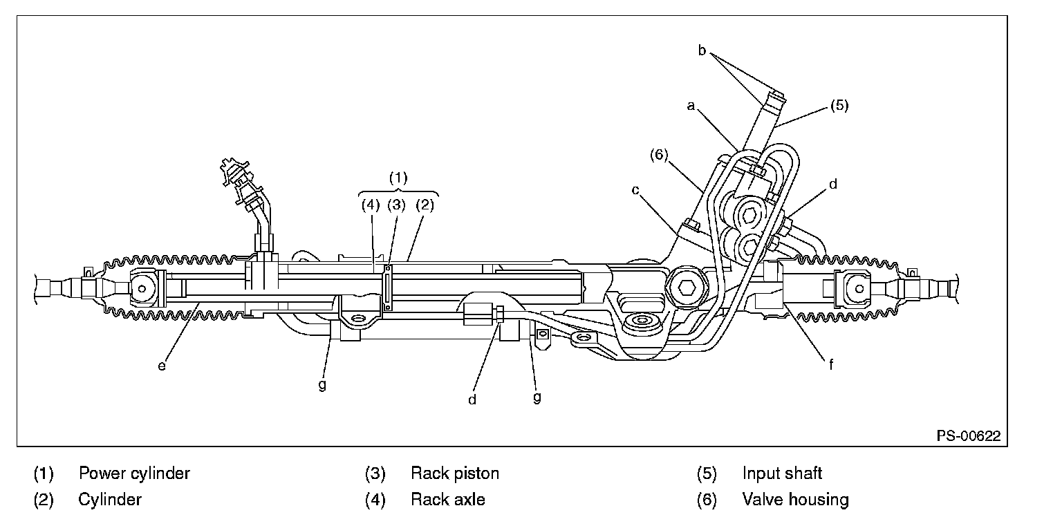 8) If leak is other than a, b, c, d or g, or if oil is leaking from gearbox, move the right and left boots toward tie-rod end side, respectively, with the gearbox mounted to the vehicle, and remove fluid from surrounding portions. Then, turn the steering wheel from lock to lock about 30 to 40 times with the engine running, and make comparison of the leaked portion immediately after and several hours after this operation.