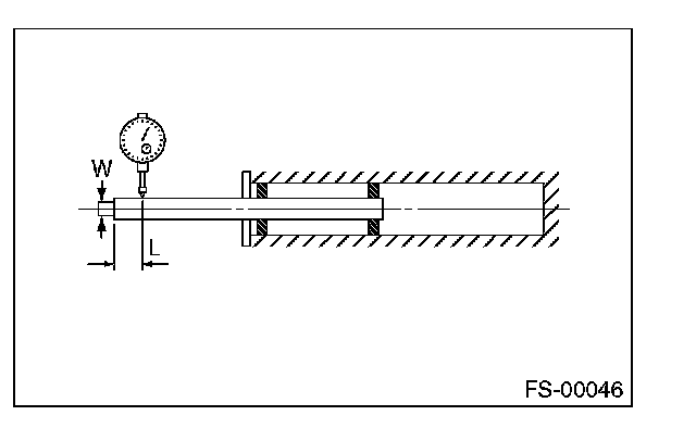 Fix the outer shell in place and fully extend the rod. Set a dial gauge at the end of rod L [10 mm (0.39 in)], and then read the dial gauge indication P1 while applying a force of W [20 N (2 kgf, 4 lb)] to the threaded portion. Apply a force of 20 N (2 kgf, 4 lb) from the opposite direction of "W", and then read the dial gauge indication P2.
