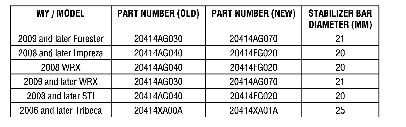 If you encounter a rubbing type noise coming from the front stabilizer bat; especially at low ambient temperatures, the stabilizer bar bushings may need to be replaced. A modification was made using a different material that is more durable which will eliminate the noise.