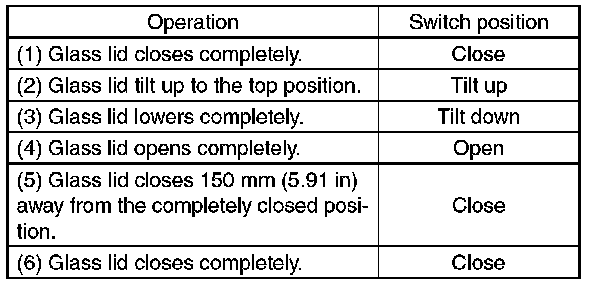 4. Keep pressing the tilt up switch within 5 seconds from releasing the switch, glass lid automatically performs the tilts down -} slides open -} slides close operation, then the initialize operation is completed.