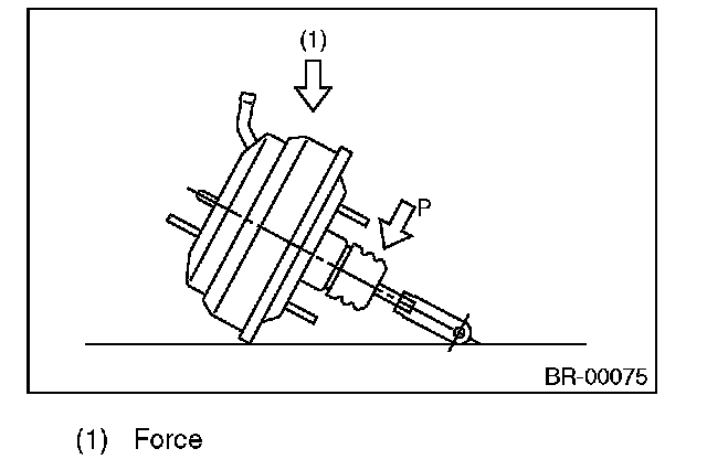 ^ If external force is applied from above when brake booster is placed in this position, the resin portion as indicated by "P" may become damaged.