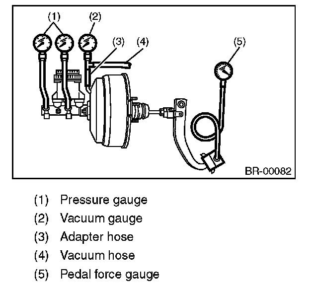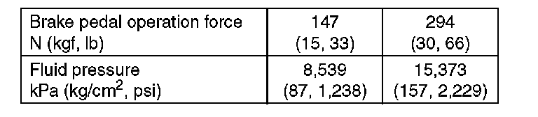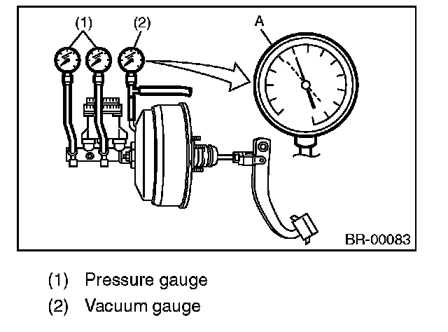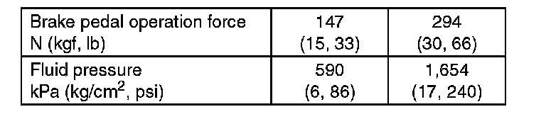 Turn the engine OFF, and set the value of the vacuum gauge to "0". Then, check the fluid pressure when the brake pedal is depressed. The pressure must be greater than the specification listed.