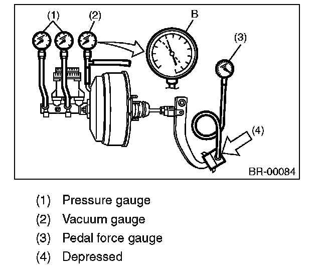 1) Start the engine and depress the brake pedal with a pedal force of 196 N (20 kgf, 44 lb). Keep the engine running and keep the pedal pressed until a vacuum of point B = 66.7 kPa (500 mmHg, 19.69 inHg) is indicated on the vacuum gauge.