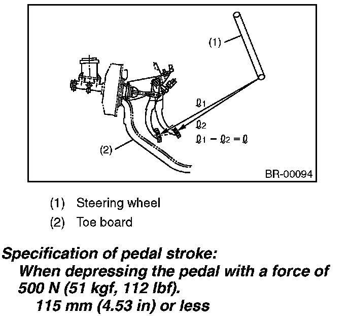 Run the engine at idle after warming up the engine, and depress the brake pedal with a force of 500 N (51 kgf, 112 lb). Measure the distance between the brake pedal and steering wheel. Release the pedal, and measure the distance between pedal and steering wheel again.