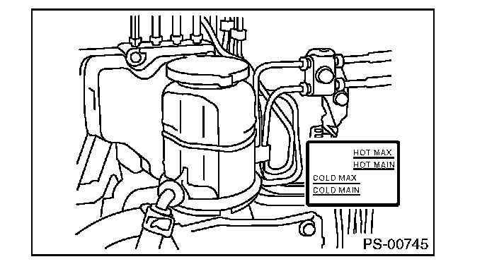 2) Check at power steering fluid temperature 80°C (176°F); read the fluid level on the "HOT" side.