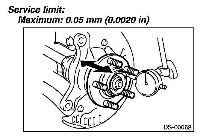 2) Inspect the lean of axis direction using a dial gauge. Replace the hub bearing if the play exceeds the limit value.