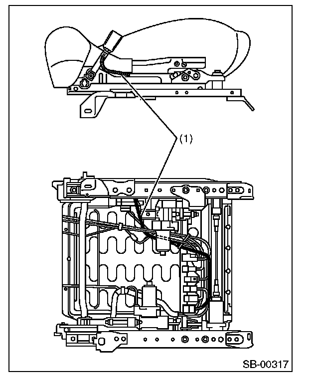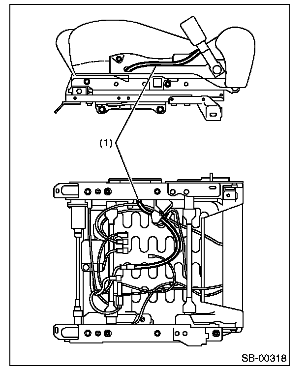 - Inner seat belt assembly harness (1) must be routed securely as shown in the figure, as it can affect the performance of the seat position sensor and occupant detection system.
