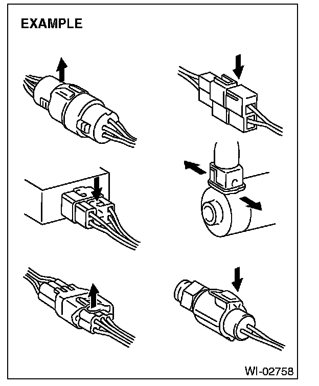 5. Some connectors are provided with a lock. One type of such a connector is disconnected by pushing the lock, and the other, by moving the lock up. In either type the lock shape must be identified before attempting to disconnect the connector. To connect, insert the connector until it snaps and confirm that it is connected securely.