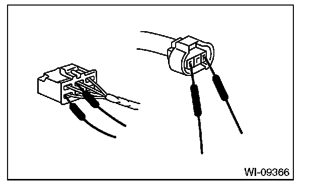 6. When checking continuity between connector terminals, or measuring voltage across the terminal and ground, always contact tester probe(s) on terminals from the wiring connection side. If the probe is too thick to gain access to the terminal, use mini test leads.