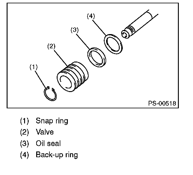 11) Using a snap ring pliers, remove the snap ring, valve, oil seal and back-up washer.