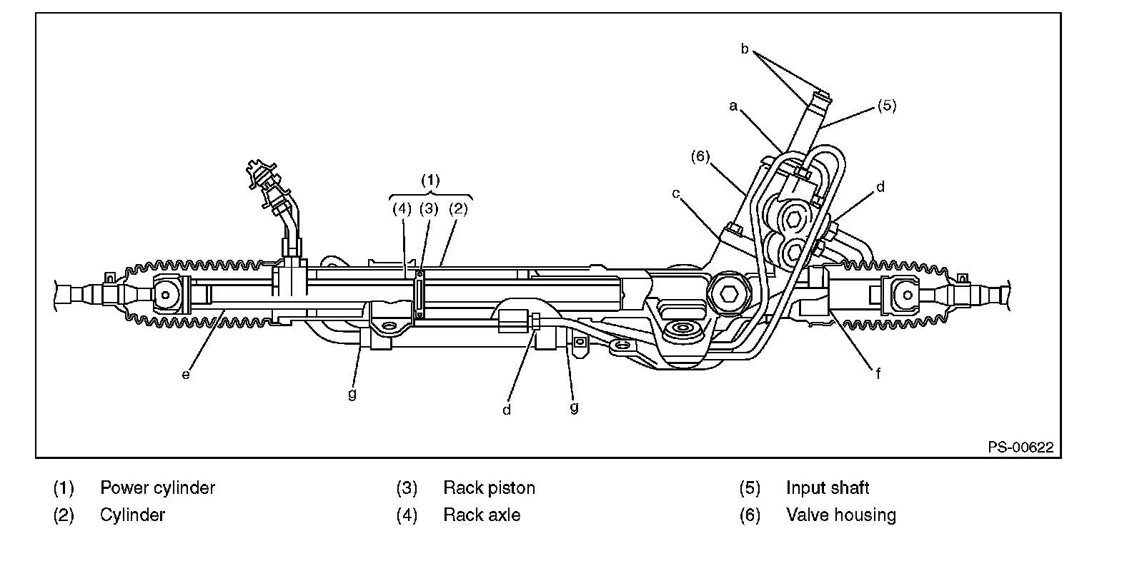 8) If leak is other than a, b, c, d or g, or if oil is leaking from gearbox, move the right and left boots toward tie-rod end side, respectively, with the gearbox mounted to the vehicle, and remove fluid from surrounding portions. Then, turn the steering wheel from lock to lock about 30 to 40 times with the engine running, and make comparison of the leaked portion immediately after and several hours after this operation.