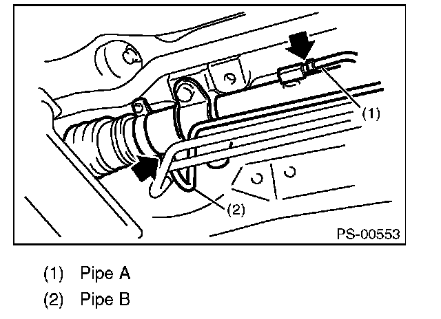 8) Remove the one pipe joint at the center of the gearbox, and connect the vinyl hose to the pipe and the joint. Discharge the fluid by turning the steering wheel fully clockwise and counterclockwise. Discharge the fluid similarly from other pipes.