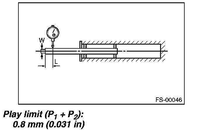 Fix the outer shell in place and fully extend the rod. Set a dial gauge at the end of rod L [10 mm (0.39 in)], and then read the dial gauge indication P1 while applying a force of W [20 N (2 kgf, 4 lb)] to the threaded portion. Apply a force of 20 N (2 kgf, 4 lb) from the opposite direction of "W", and then read the dial gauge indication P2