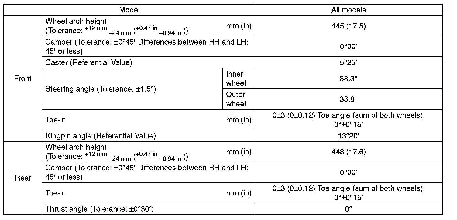 - Other items indicated in the specifications is not equipped with adjustment mechanisms. If other items exceed specifications, check the suspension parts and connections for deformation. If defective, replace with new parts.