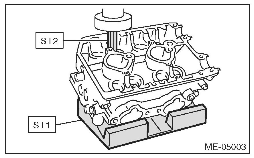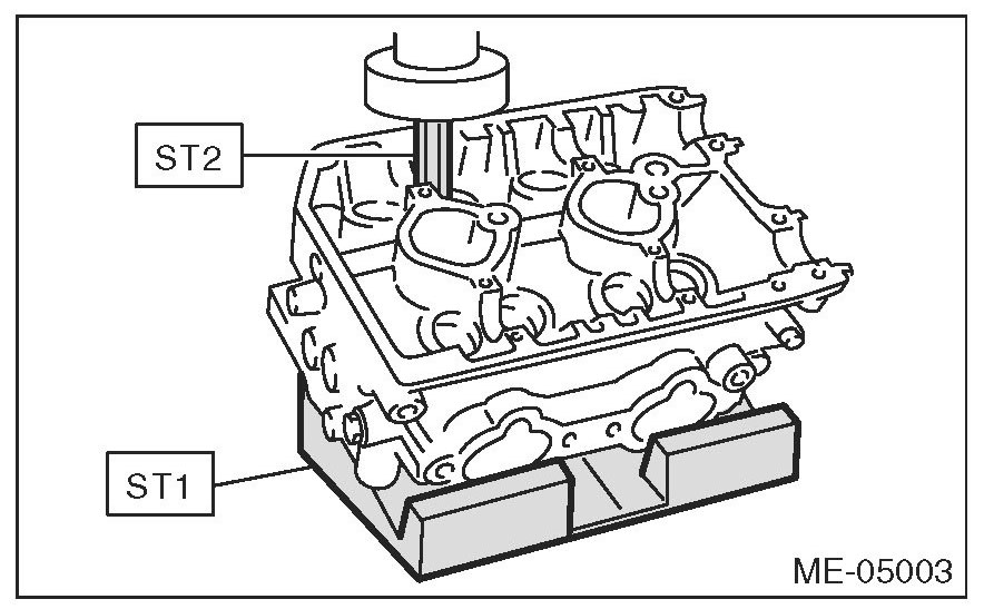2) Place the cylinder head on ST1, and use ST2 to press-fit the oil seal.