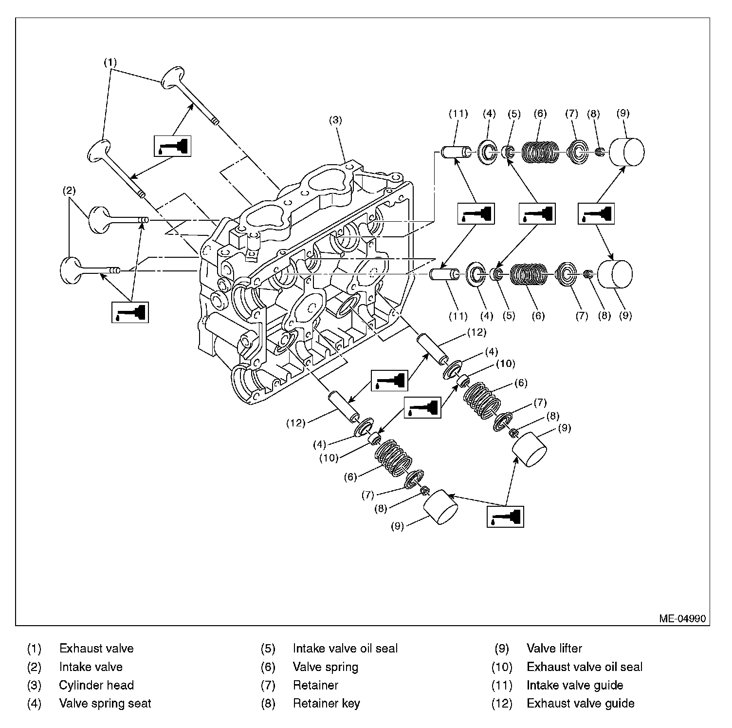 1) Check the clearance between valve guide and valve stem. The clearance can be checked by measuring respectively the outer diameter of valve stem with a micrometer and the inner diameter of valve guide with a caliper gauge.